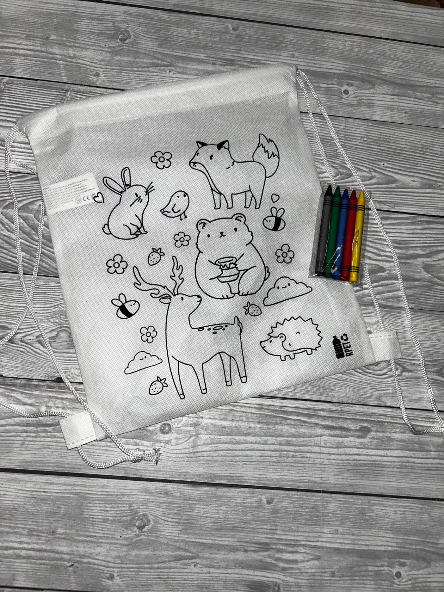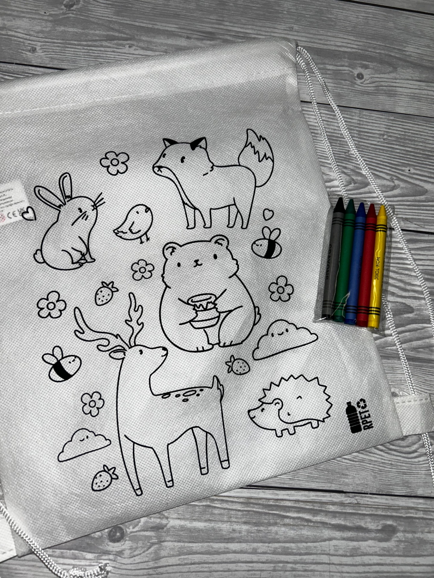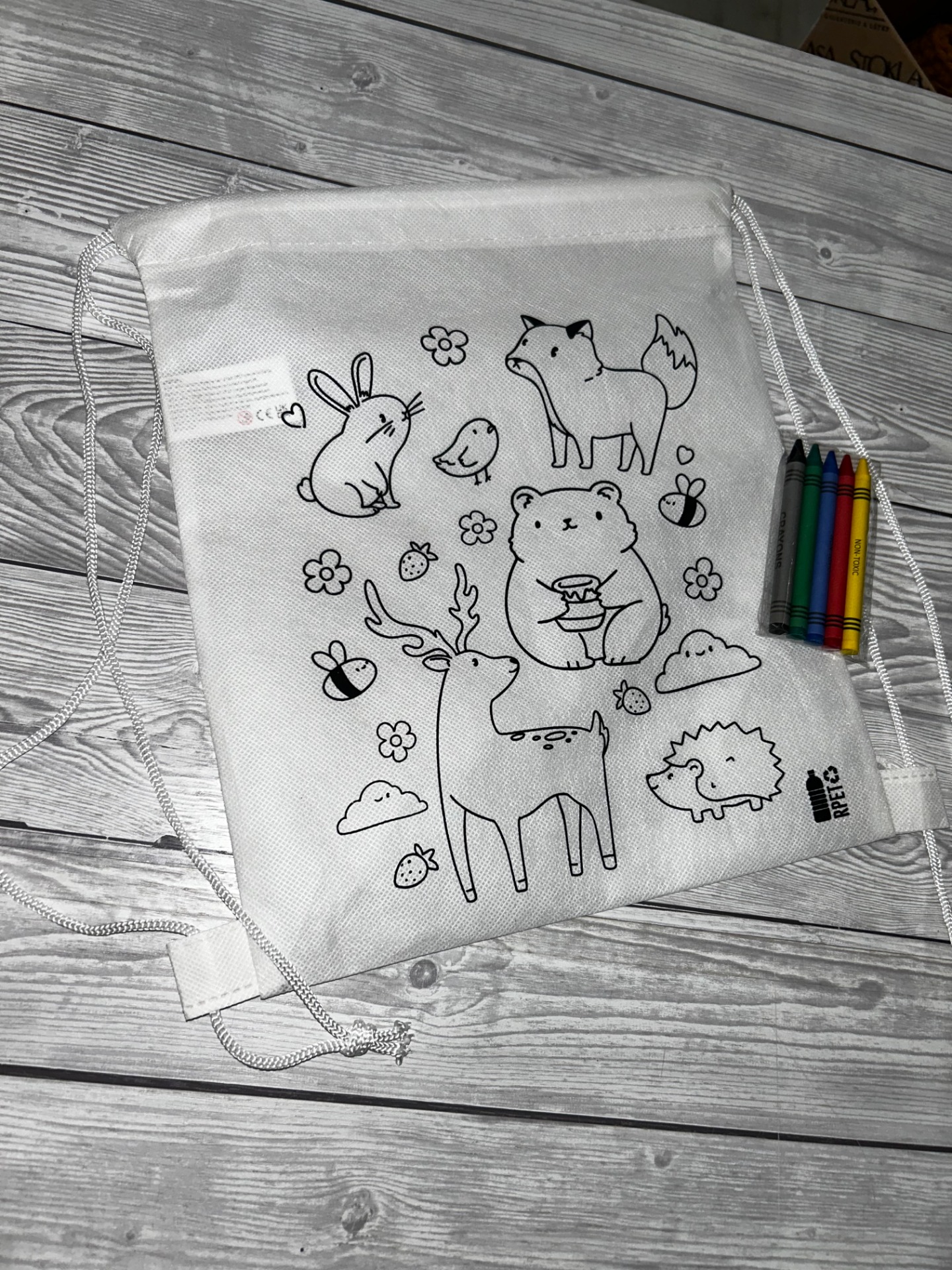 Materiál - z netkané RPET tkaniny s 5 voskovkami k vybarvení.